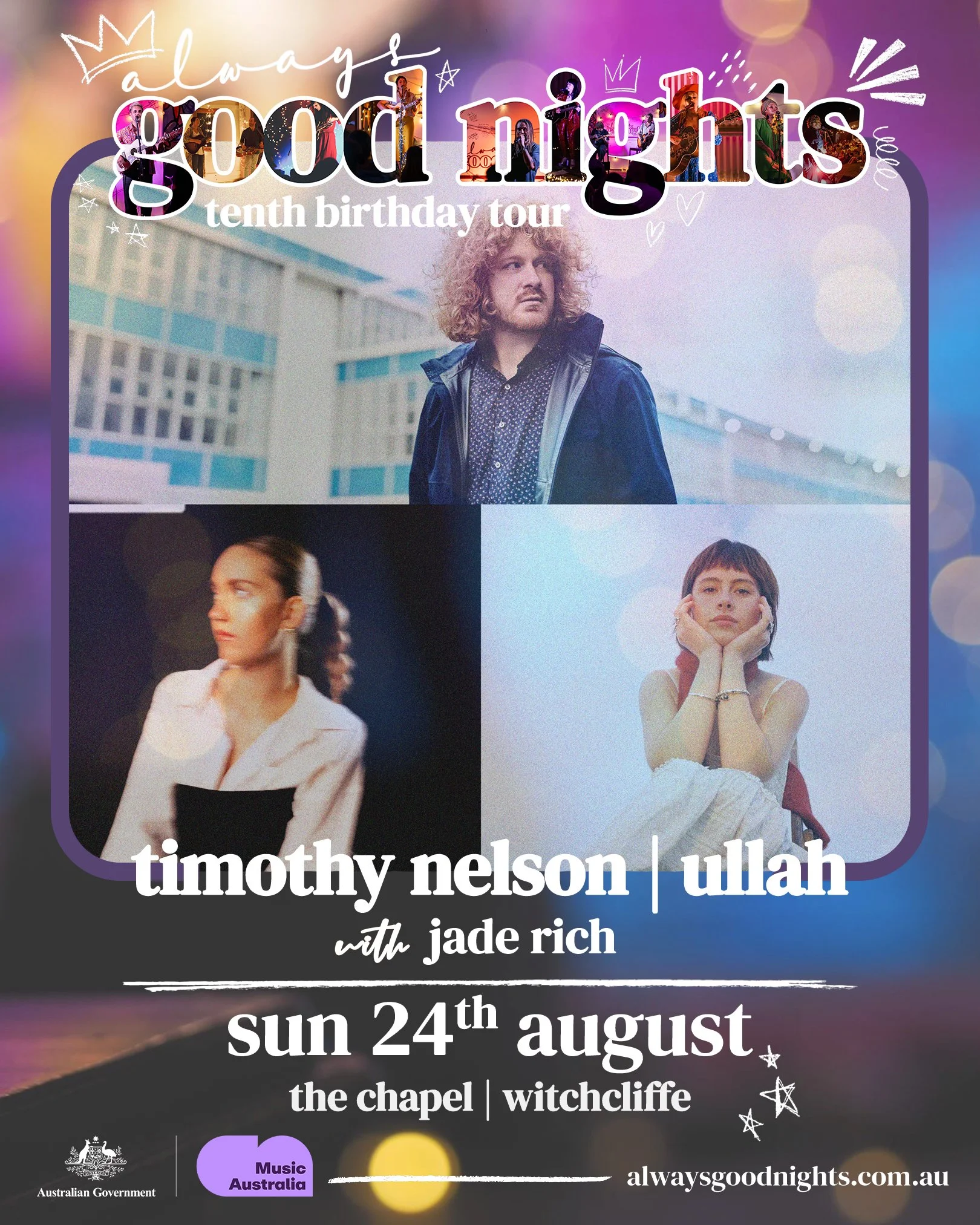 Good Nights is turning 10!! To celebrate, we've put together some very special shows in some stunning venues across WA. Join us for an intimate show at The Chapel in Witchcliffe for an evening of music with Timothy Nelson, Ullah & Jade Rich.